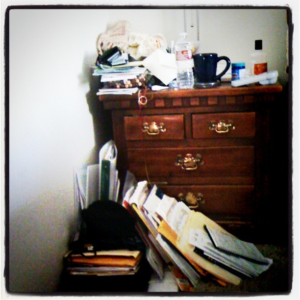 Looking at my bedside mess this morning, I realized that the principles of Inbox Zero (Mann refers to them as Articles of Faith)* can be applied to the clutter in other parts of my life. My son calls it my attempt at Lifebox Zero.