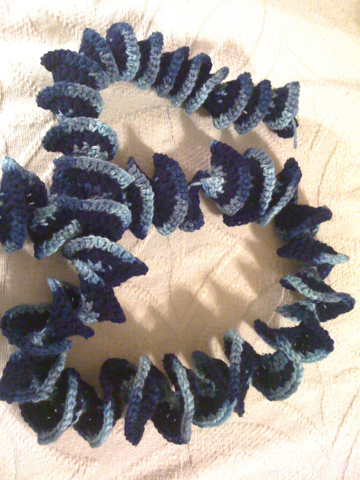 This one is super easy to make. Just three rows. I used a variegated blue yarn for the first and third rows and a solid navy for the second.
