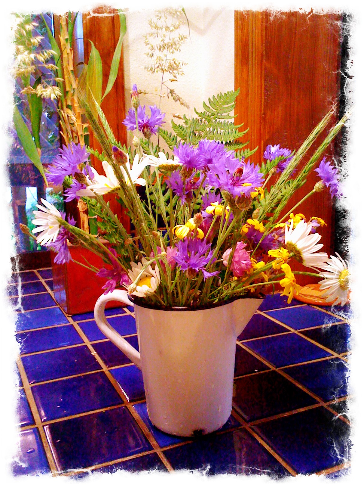 (My Oregon wildflowers are sitting in the antique enameled measuring cup I bought at a Goodwill store the summer we spent a week in Banff)