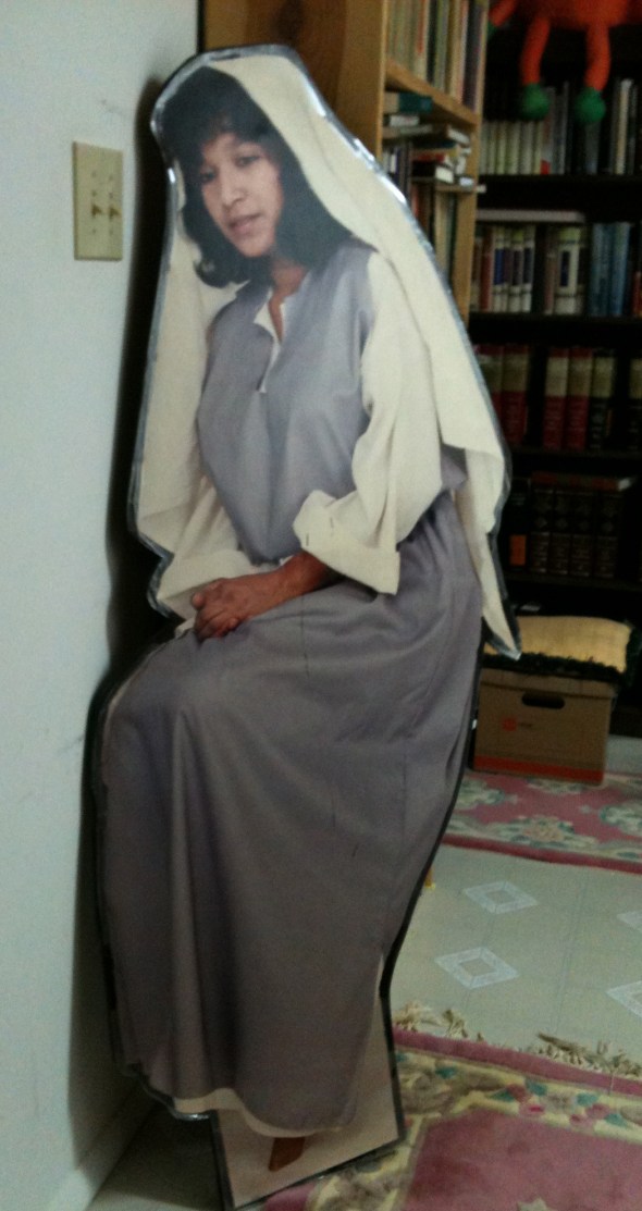 In the mid-1990’s I was asked to pose as the Virgin Mary for the company’s* giant nativity scene that was lit for every one travelling down the highway to see. After several years of use, the nativity was being trashed.That’s when my mother rescued my laminated replica. (Notice how they PhotoShopped my face white to blend with a white Joseph and wisemen, but forgot about my arms!)