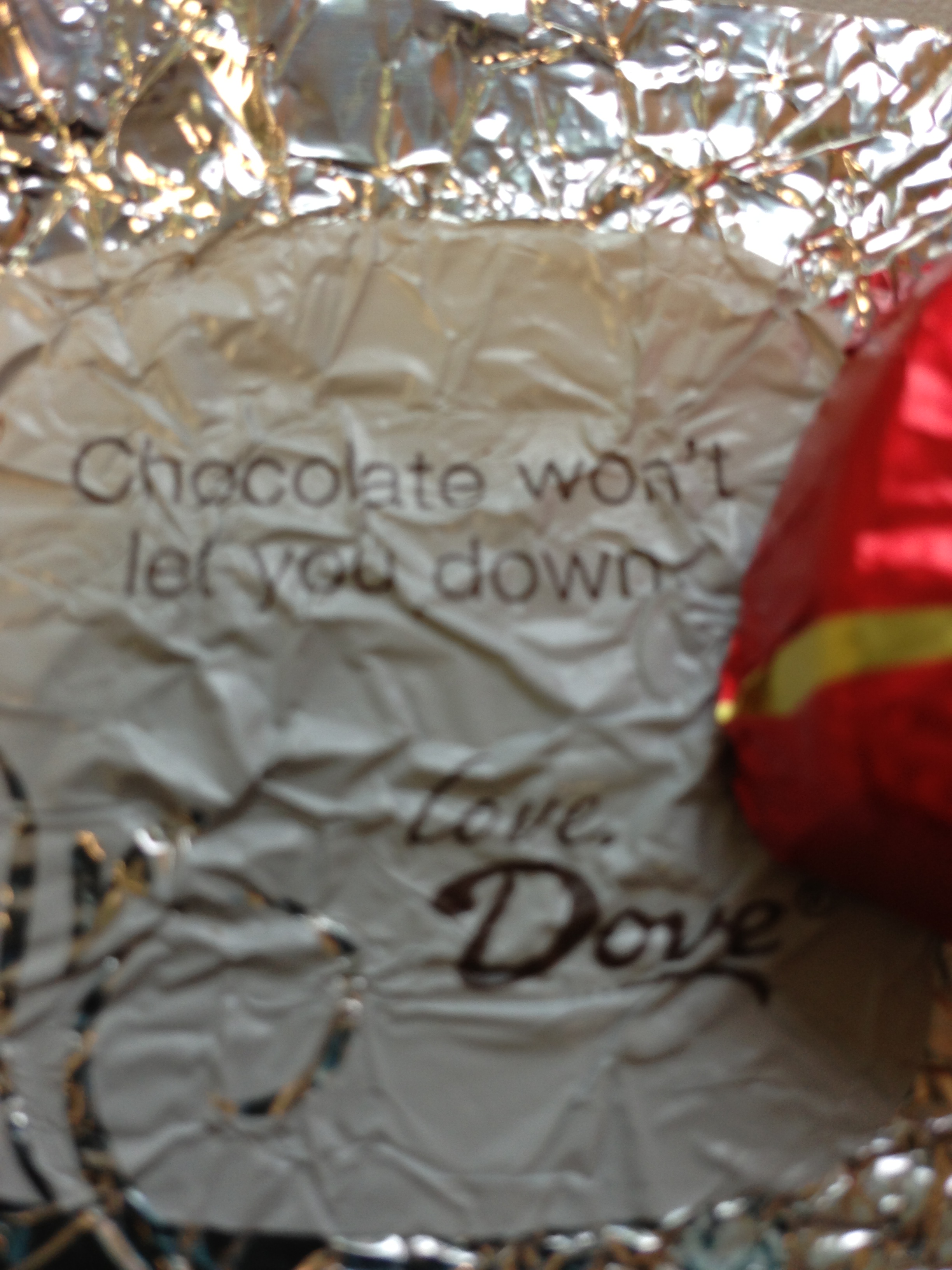 Blessing her silently with twins within the next 12 months (Hope she appreciates this as much as I did the chocolate), I snarkily said, “Perhaps Dove has a witty saying that will lift my spirits.”